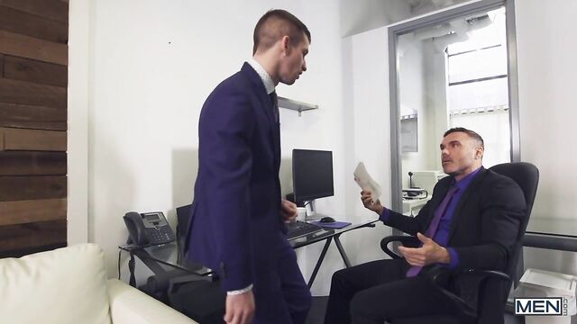 Thyle Knoxx wants to get out of work early, but his hard-ass boss Manuel Skye won't even give him a chance to ask for permission. When Thyle finds out that Manuel recently broke up with his boyfriend, he realizes that there's a sure-fire way to get his boss in a more receptive mood. Thyle drops to his knees and gives Manuel a hard, sensual blowjob, pounding the back of his throat with his boss' thick cock. Manuel pushes Thyle to the limit, exploring every inch of his body with his tongue before pounding the aspiring assistant's tight ass all over the office.