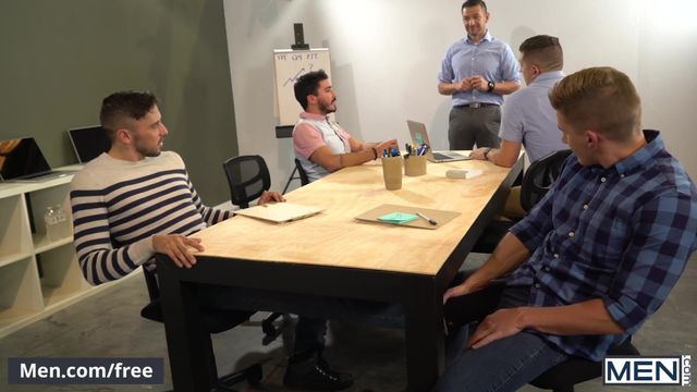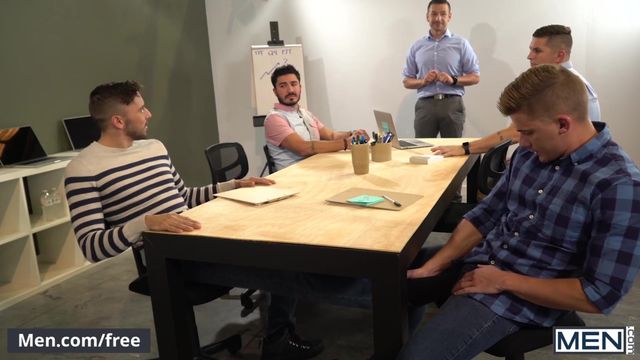 Handsome Jake Porter and cutie Shane Jackson get caught up in a rough game of footsie during a work meeting. Chiseled Jake is so horny that as soon as the others leave, he jumps right up onto the table so he can pull athletic Shane’s long cock out, and into his mouth. They 69 right there on the table blowing each other’s hung dicks before Jake sits his eager ass right on top of him for a stiff ride.