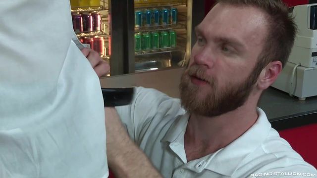 Hopeful new-hire Peter Marcus sits down with General Manager Dakota Rivers for an interview at the 'Drive Thru'. As Dakota reviews Peter's application, he notices he doesn't have any experience in the food industry. Peter quickly replies, 'I'm a fast learner and I'm eager to please.' Dakota wants to see just how eager Peter is. Guiding Peter to his knees, Dakota whips his cock out. Eager for the job, Peter begins to service his potential employer's fat cock. After checking Peter's oral skills, Dakota decides to drill his tongue into his bare hole. With Peter's hole slick with spit, Dakota stuffs his meat into Peter's man hole. After taking it from behind, Peter hops on the table, legs up, taking hard, powerful thrusts from Dakota. The intense drilling from Dakota's cock is too much for Peter and he blasts a thick white load onto his furry torso. Boss man Dakota strokes his hefty load onto Peter's hole. When it's all said and done, Peter still didn't get the job!