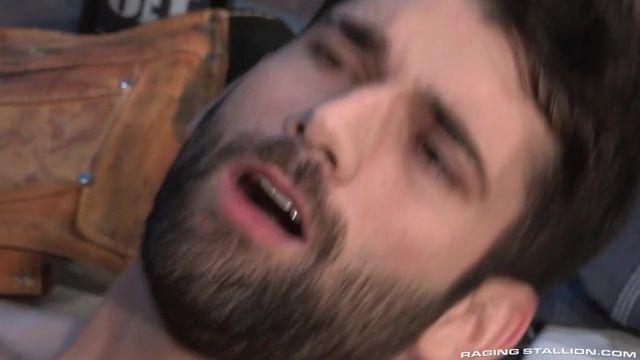 The pressure is high to get the job done on time, so Gabriel Taurus saves time by taking a piss in a bucket. Tegan Zayne comes over to lend a helping hand. Gabriel's overalls fall to his knees as he and Tegan make out. Gabriel slides his tongue between Tegan's hairy ass cheeks, then probes the hole with his thumb. Sinking to his knees, Tegan sucks Gabriel's cock until saliva drips off his chin. Tegan bends over for Gabriel to take control. As Gabriel slides inside, Tegan moans with pleasure. Tegan rolls onto his back, and Gabriel's pummels him like a jackhammer. They fuck so hard, the workbench starts sliding across the floor. When he's ready to blow his load, Gabriel stands over Tegan and shoots across his face, and Tegan cums with the taste of Gabriel's load in his mouth.