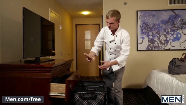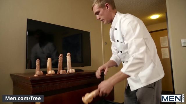 Chiseled stud Myles Landon just landed, and can’t wait to get in the shower. In the meantime, he asks room service to unpack his bag, and lucky hunk Zane Anders gets tasked with the job. Tall, slim Zane is shocked to see the all the dildos at the bottom of his bag, and his curiosity gets the better of him as he tests one of them out on his tight little hole. Horny Myles exits the shower, and catches him, but the only thing he wants to do now is to give Zane a big, full sampling of the real thing!