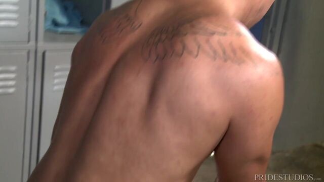 Adrian Suarez is sitting in the locker room when Vic Rocco walks in after his workout. They strike up conversation about all the tattoos that Vic has on his arms and then Adrian notices that Vic is sporting a big cock under his workout shorts. Vic asks if he likes what he sees and they both start making out. Vic pulls out his massive cock and Adrian works hard at trying to deep throat all of it. After sucking it for a while, Vic pulls Adrian up and puts him on the bench and sucks his cock and also rims his ass back and forth. Adrian then plays with Vic's cock some more and milks out pre-cum and eats it. Vic then starts fucking Adrian raw with his big cock. Adrian rides him like a champ before turning around and taking the cock from behind. Vic drives his huge cock deep inside Adrian and then flips him on his back and fucks him deep until he cannot hold back and pulls out and as he is shooting his load, Adrian also cums at the same time.
