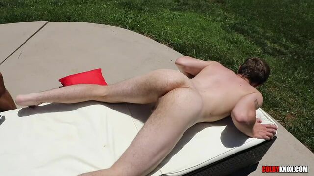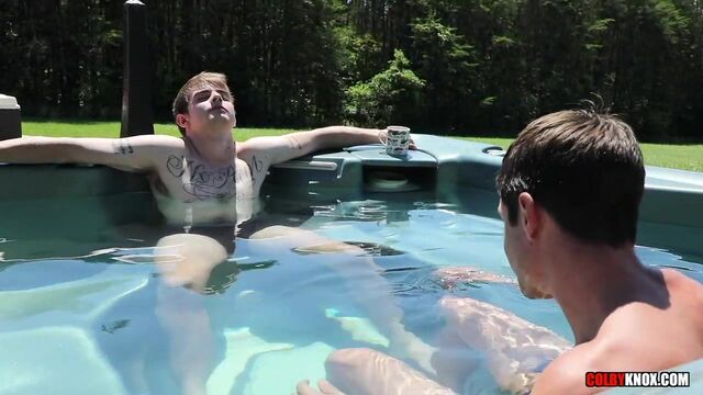 In this week's new porn video release from ColbyKnox, the boys are excited to present the debut of Willy T. Colby Chambers is starting his day, heading for the hot tub with a cup of coffee; he finds Willy has beat him to the punch. Colby is a little surprised to see ANYONE at the ColbyKnox house awake before him. The sexy, tattooed bottom stud is seemingly waiting for him!!! The boys chitchat and enjoy their coffee for about as long as Colby Chambers can handle. Eventually, the video takes that inevitable turn. They start fooling around in the hot tub, with Colby getting Willy T. on his knees so he can feast on Colby's large, thick cock. Willy T. licks and sucks on Colby's big, plump meat until both are ready to take things a little further. Colby Chambers just loves to bend boys over in his hot tub, so he stands Willy up with his ass just above the water. Colby takes his time penetrating this sexy Tennessee boy, savoring each pleasurable moment. The boys eventually move their party to one of the poolside chairs because they need more room. To wrap things up, Colby and Willy go at it, under the blazing NC sun, in the middle of the pool deck!!!! Enjoy!!