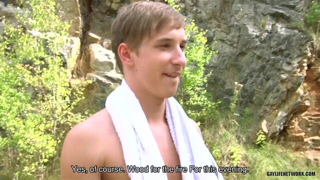 Adam is a horny young man who can't deny his hard uncut cock. While away from his friends gathering wood he takes the opportunity to enjoy his own, revealing his hard uncut cock and having a wank in the open. Kevin arrives at just the right time, and of course he's soon offering to suck it for him. Adam might not usually be into boys, but with his cum stroked and sucked out of his desperate dick, erupting over Kevin's face, he's happy to give his buddy a hand with his load, wanking Kevin a little and watching his dick splash out a hot messy fountain. Something tells me a little more friendly cock play might be on the cards for these two.