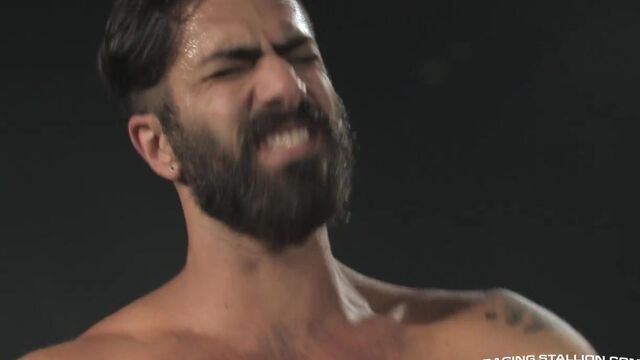 Sam Barclay kneels before dark and beautiful Adam Ramzi. Gazing into those warm chestnut eyes, smoothing his hand over his furry brown body and in his thick beard. Licking his lips, sucking his juicy nipples before finally devouring his pretty uncut cock and ball sack. Adam bends over the ballsy Brit to make a feast of his tight pink hole. He rims him into ecstasy, then puts Sam's huge balls and uncut cock down his bearded throat, licking back and forth between ass and man parts. Once Sam is primed, Adam punches his cock into the pink wet spot, his hairy nuts slapping against smooth sweaty ass-cheeks. In the passion, they flip over and Adam tames him literally by the cock and balls. While Adam fucks his ass hard and fast he steady jacks Sam's hard red throbber until the white hot explosions project out onto his sweaty abs. Adam then pulls out and sprays a load on satisfied Sam. After great pleasure, both men collapse in a tongue embrace.