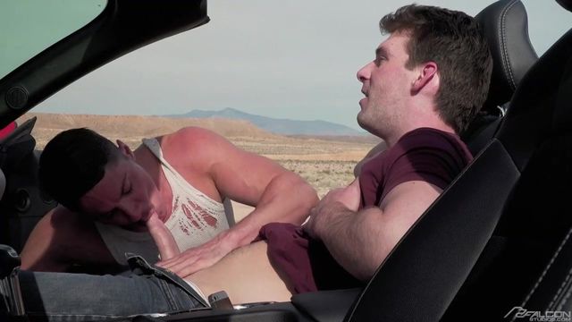 Dustin Holloway is in the car by the side of the road waiting for Fane Roberts to return from getting gas. He's jacking off in the front seat when he looks up to see Skyy Knox walking across the barren desert. As Skyy approaches, he asks if Dustin needs a helping hand and reaches down to feel the stud's hard dick. Skyy wants to do more than give Dustin a handie and opens wide to take Dustin's rod in his mouth. After giving Dustin a nice head session, Dustin wants access to what Skyy is packing and the guys take the fun to the side of the road. Dustin can't wait to get Skyy in his mouth and gets on his knees to service the horny stranger in the dirt. When Dustin gets Skyy as hard as he can be, Skyy bends the hunk over the car and slips his big dick into Dustin's open and ready ass. 'Take that power,' Skyy yells out as he picks up the pace and slams Dustin even harder. Dustin wants to feel Skyy deeper inside and lies back on the hood of the car. Skyy spits on Dustin's ass to lube it up and then once again slips inside the horny stud. The steady rhythm makes Dustin's eyes roll into the back of his head as he jacks his rod and blasts all over his tight ripped body. Skyy sees Dustin's handiwork and pulls to unleash a load of his own. Dustin wants to feel it hit his body and goes down on his knees in front of the muscle hunk to get his smooth chest doused with Skyy's pleasure.