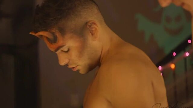 Passionate threesome fuck scene set on Halloween - Corbinfisher