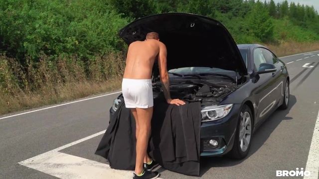 When Marty's car breaks down, David Lee rolls up on his scooter to see what's up. He pretends to help check the engine but then steals Marty's shorts and scoots away! By the time the naked Marty catches up to him, David is jacking his cock while sniffing Marty's shorts. David pushes Marty to his knees and fucks his mouth, then roughly jacks his dick before bending the bottom over to pound his ass in doggystyle. The top lies on the ground as Marty rides him, then fucks Marty in spoon before getting back up to cum all over the bottom's ass. Then David pushes Marty against the wall and has the bottom jerk off till he cums in his hand!