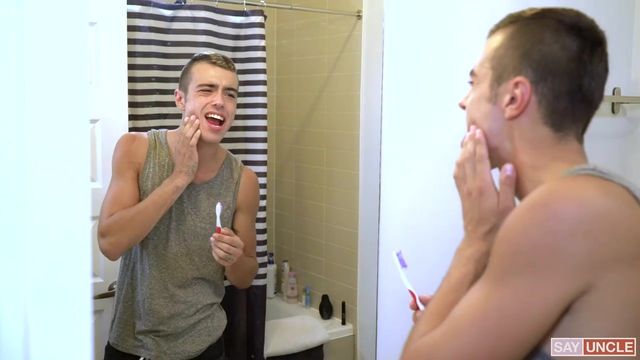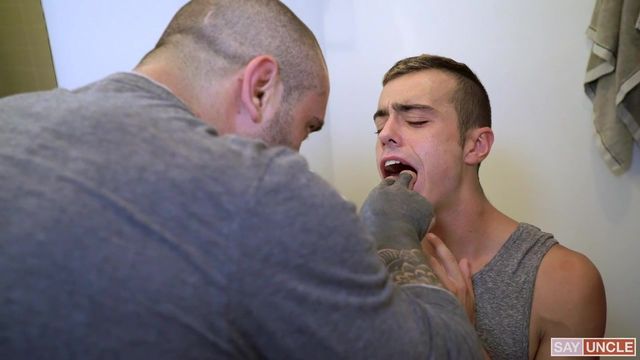Stepson Sean Peek is brushing his teeth after having surgery when he notices some discomfort in his stitches, so stepdad Markus Kage offers to take a look and see if everything is ok with his mouth. Sean likes it a little too much when Markus puts his fingers in his mouth so Markus takes full advantage of the situation.
