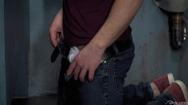 After several hours of driving Route 66, Fane Roberts and Dustin Holloway pull over at a rest stop so Dustin can take a piss. As Dustin stands at the rest stop urinal, he notices Derek Maxum head into the stall next to him and as Dustin is washing his hands, he sees Derek's big meaty dick slide through a hole in the wall. Dustin isn't sure if he should run or get on his knees but when he hears Derek's deep voice command him to 'suck it', Dustin does as he's told and takes the giant rod in his mouth. It grows thicker and harder with every slurp from Dustin, and as a pool of spit collects on the floor under the two hunks, Dustin peels off his shirt and unzips his pants for easy access to his own growing boner. Derek his ready to get a look at the eager stranger sucking his dick and comes out from inside the stall. He's ready to taste a dick as well and happily services Dustin's raging hard-on. All the sucking gets Derek in the mindset to take the random public encounter to another level and bends Dustin over the wall to eat his ass. As the two studs get completely naked, they go back to taking turns sucking each other off. With his dick worked to the max, and a hunky naked stranger in front of him, Derek lets go of any inhibitions he may have left and blasts his load all over Dustin's tight pecs and body. The thrill of the public sucking in the dirty bathroom combined with the feel of Derek's warm load running down his body is all it takes for Dustin to finish up. Dustin moans out and polishes the floor with his own creamy brand of liquid before the strangers part ways never to see each other again.