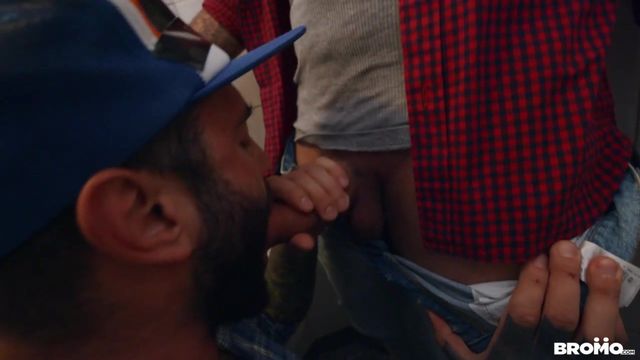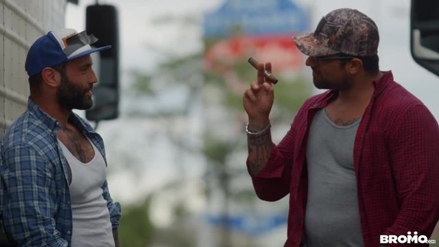 As trucker Ryan Bones is sitting outside his rig, puffing on a stogie, he sees Markus Kage walking around looking for a ride. He eyes up the tattooed stud and leads him into the bathroom, where Markus gets a good look at Ryan's thick cock, then pushes him up against the wall and sucks it. Ryan makes Markus lick his boots and even steps on his face, then motorboats Markus's hairy ass and tongues his hole. The dominant top fucks Markus doggystyle, reaching around to stroke his cock. Then Markus rides Ryan's big rig, and it feels so good, the bottom cums a big load before taking Ryan's jizz on his trucker hat.