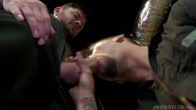 Bentley is standing up leaning on his work broom totally tired when Jack comes down the stairs of the maintenance room and discovers him. This arouses Jack and he starts playing with his cock through his coveralls. Bentley starts to awake and sees Jack there with his cock outline showing and the two just stare at each other for a bit. Jack pulls out his cock and Bentley sucks it. Jack then sucks Bentley for a while before putting him against the stairs and rimming his ass. Jack fucks Bentley up against the stairs first and then he lies down on the ground and Bentley rides him. Jack then decides he wants to be fucked by Bentley's huge cock and Bentley fucks him missionary on the floor until Jack shoots his load all over himself. Bentley pulls out and shoots such a huge amount of cum it hits Jack in the face. Enjoy!