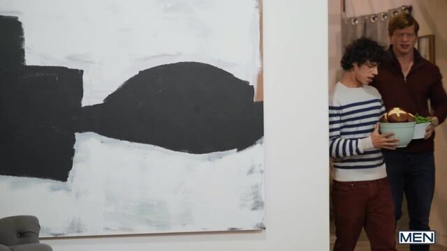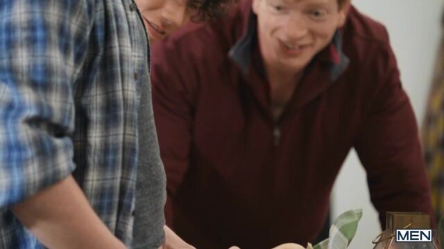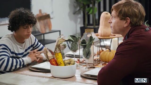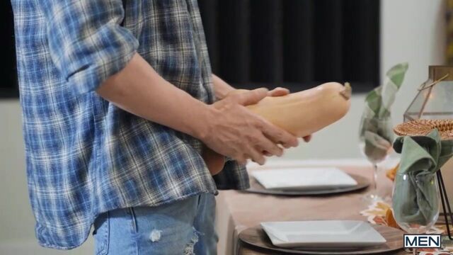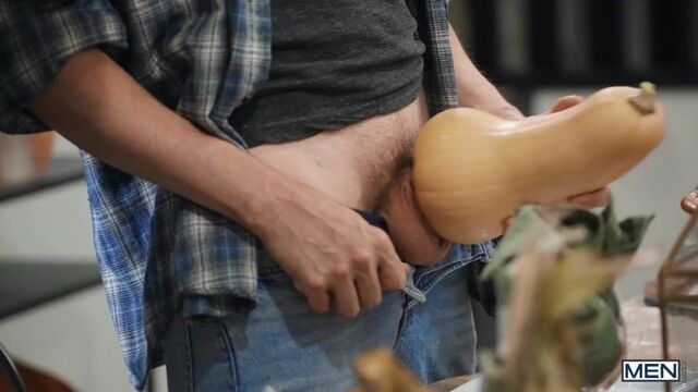 Nate Grimes planned a special Friendsgiving feast, but when his buds cancel at the last minute, he asks his neighbors to share the bounty. Kyle Connors and Kaleb Stryker are excited to be invited, but Jack Hunter is most interested in playing with Nate's prize-winning gourd... and himself, as Nate catches him jacking off in the bathroom before dinner. When the other guys go help Nate with the food, Jack decides to fuck the squash and see if it feels as good as it looks. Kyle and Kaleb find Jack balls-deep in the butternut and get so turned on, they get naked and Kaleb starts sucking Kyle's cock. Nate can't believe his dinner party has turned into a veggie orgy, but Jack encourages him to give the gourd a try. Nate's dick gets super hard fucking the squash, and soon he's joining Kyle and Kaleb and getting fucked in a hot threesome as Jack watches and strokes his cock. Kyle, Nate, and Kaleb give Jack a triple facial before the veggie perv blows a hot load on the sexy squash.