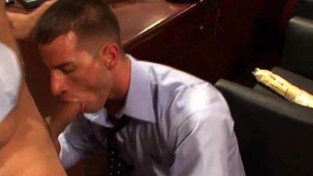 Jay is making a lunch delivery, but the secretary has stepped out. He pokes his head in Rusty's office to drum up some business, but Jay winds up getting the delivery as Rusty pokes his head in that tight ass.