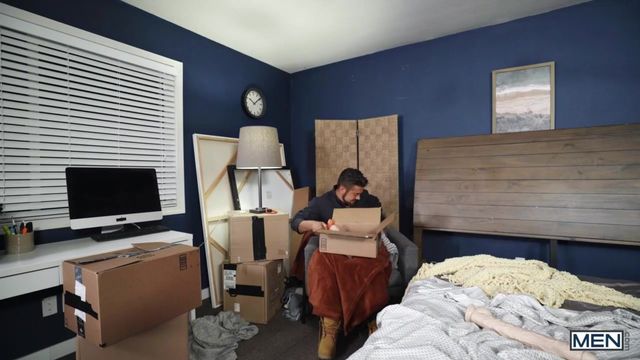 When professional mover Dante Colle spills a box of dildos in customer Nate Grimes's new bedroom, he soon gets very UNprofessional, playing with two thick plastic cocks as if they were nunchucks and sliding the most massive one into his overalls to swing it around. He tries sucking the biggest toy and can barely fit the head in his mouth! When he hears Nate coming, he sticks his own cock through the bottom of the dildo box and conceals himself. Sure enough, when Nate finds the unfamiliar dick in his box of toys, he starts sucking it, quickly discovering Dante's ruse. Nate sits on Dante's cock before telling the top to fuck him with the massive dildo, and Dante can't believe his eyes as the power bottom's hole swallows the whole thing! That hole is still nice and tight when Dante fucks Nate doggystyle and piledriver, and soon Dante has Nate cumming before finishing off with a hot facial!