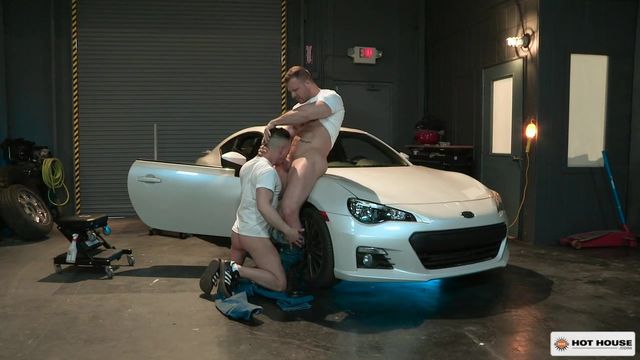 While washing the windshield on a client's car, lustful apprentice Rex Cameron gets 'Overpowered' by muscle mechanic Austin Wolf, who quickly takes control of the situation. Working together on the car, testosterone in the air is making for a steamy setup. The burly mechanic walks straight over to his co-worker and pushes him down on the cars hood and pulls Rex's jeans to his ankles. Rex lifts one leg up on the spotless sports car to give Austin total access to his willing ass. With his tongue as his tool, Austin lathers up Rex's hole with thick spit. Austin drives the action and takes a break from probing Rex's hole with his tongue to get Rex on his knees to service his fat fuck stick. More than willing to service his superior's cock, Rex takes Austin's cock down his throat to the base until he gags on it. When Austin has had enough of Rex's warm mouth, they move to a sliding workbench and Rex slams his ass on Austin's dick. With his cock deep inside Rex, Austin reaches back and stuffs a finger in his hole to give Rex the ultimate stretch. They move it back to the car and Rex continues to take a rough pounding while on top of the car. As Austin keeps drilling his fuck hole, Rex shoots a thick load onto his smooth abs. Austin unloads on Rex's thigh and wipes it up to give Rex a taste and finish with a cum drenched kiss.