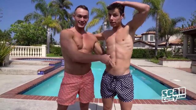 Fit and toned Kaleb is swooning over hard-bodied hunk, Jayce. They’re both packing huge, thick cocks and can’t wait to get things started. For Jayce, it’s a completely new experience so he’s doubly anxious, but in a good way! “We are going to do a lot of fun things today and new things for Jayce, right? What’s something new that you haven’t done before?” asks Kaleb. “Well, fucking a guy in the ass for one,” responds Jayce. “Oh man, who you gonna fuck?” asks dark-haired Kaleb with a smirk. “I think his name is Kaleb,” says Jayce amusingly. “Oooh, I’m excited, let’s go get this booty pounded,” responds an overly eager Kaleb. “What are you most excited about?” inquires Kaleb. “Eating a guy out! Can’t wait!” exclaims Jayce. As Kaleb shows off his bare bottom, Jayce spanks his ass cheek and proclaims that he can’t wait to smash it.