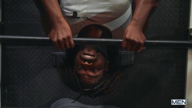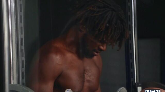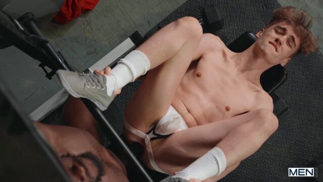Twink Tannor Reed gets horny just looking at hunk Devin Trez working out next to him at the gym, so Tannor comes around the plexiglass partition to do some squats right in front of the hottie where Devin can get a good look at his ass. Devin asks Tannor for a spot, which gives him the chance to show off his big cock hardening in his shorts! Tannor can't resist and sits on Devin's face, then gives the hung top a blowjob. Devin eats Tannor's ass and fucks him doggystyle, then lies back on the bench so Tannor can ride him. Tannor can't believe how deep Devin pounds him in missionary, then he leans against the plexi barrier as Devin thrusts into him doggystyle till he cums all over the glass! Tannor takes a facial, and makes sure to wipe up all his cum.