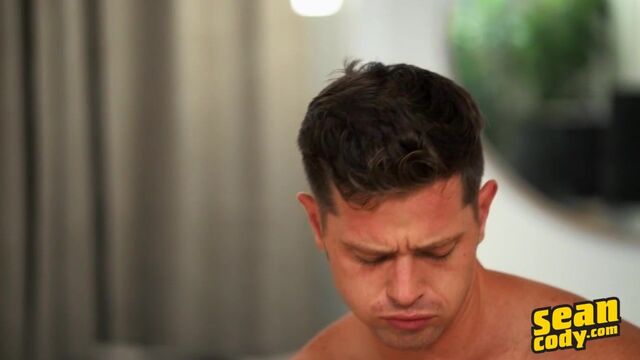 As Deacon prepares for his first scene back in the studio by jacking his hard cock till he cums, newbie Justin talks about how turned on he is to shoot with the handsome and muscular Sean Cody favorite, who's just his type. "He's super fucking hot, and I love his ass so much, I'd fuck it all day." Justin adds that one thing you can expect from him is a massive cumshot! The guys' chemistry is immediately palpable as they passionately kiss on the bed and suck each other's cocks until Deacon is begging Justin for that dick in his hole. The top is happy to oblige, filling Deacon in missionary and then pounding him in doggystyle. Most impressive of all, Justin showers Deacon's muscular chest and abs with a cumshot that more than lives up to his promise! Spent, Deacon shoots his load all over the top's face.