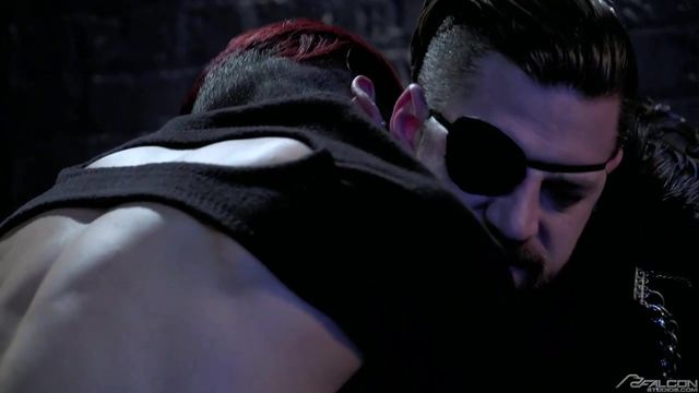 Lord (Andrew Stark) is angered, and he sends his Henchman out to find some answers. Left to his own devices, Lord turns to his courtesan, Alleycat (Armond Rizzo), to relieve the tension. Stripping off Lord's shirt, Alleycat leans in to teasingly lick Lord's sensitive nipples. Lord wraps his big, strong hands around Alleycat's tight, muscular ass, probing at the crack. Working his way down Lord's impressive torso, Alleycat liberates Lord's huge cock. Opening his mouth as wide as he can, Alleycat uses every one of his mastered techniques to render pleasure to his master. Alleycat tongues the tight, hairy center of Lord's ass, and Lord returns the favor with a wet, sloppy rimming. Using his fingers, Lord pushes his saliva into Alleycat's tight but inviting hole. Reclining on his chair, Lord invites Alleycat to sit down on his cock. Thrusting upwards, Lord pounds Alleycat's willing ass. Picking Alleycat up, with his cock still buried in Alleycat's hole, Lord fucks him wherever he pleases: against the wall, on the desk, and even hovering suspended in the air. Putting Alleycat down on the desk, Lord pounds him hard until Alleycat shoots his creamy load. As Alleycat kneels down on the ground, Lord strokes his thick cock and explodes across Alleycat's face and into his open mouth. Reaching out with his tongue, Alleycat tenderly massages the tip of Lord's cock, as frothy cum drips from Alleycat's chin.