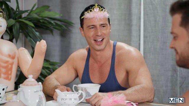Sometimes even the most masculine man needs to recharge with a beautiful tea party, and Reese Rideout has laid out the good china, served up some scones, and donned a tiara and tutu to have afternoon tea with his blow-up doll friend. When Reese's workout buddy, Johnny Donovan, lets himself in to ask his bro for a gym sesh, he finds Reese sipping tea with his pinky out and can't contain his laughter. But Reese takes teatime super seriously, pushing Johnny into a chair and bitching the pot down his throat! Johnny asks for a biscuit, so Reese fills his mouth with his cock, then gives the bottom a bit o' crumpet as he fucks his muscle ass. Naturally, Reese teabags Johnny before pounding his hole in mish. Reese cums all over Johnny, and the bottom shoots his cream onto the biscuits before eating one and feeding Reese the other!