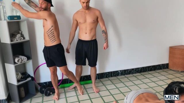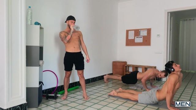 Whenever Jackson Radiz works out, he gets very horny. He starts checking out handsome Ken Summers's ass as the twink does some yoga next to him, then kisses tattooed hunk Andrea Suarez as Andrea rubs his cock. Jackson pulls Ken's shorts down, and he and Andrea take turns licking the bottom's hole, then Ken sucks both their cocks. Andrea fucks first Ken in doggystyle and then Jackson in piledriver, and then it's Jackson's turn to enjoy Ken's hole before the twink takes two cocks at once in a double penetration. Jackson fucks Ken's mouth while Ken rides Andrea, then Andrea cums on Ken's face. Jackson begs for Andrea to stretch out his hole some more as the top fucks him while Jackson strokes his cock till he cums on Ken's face, then takes a facial from the twink!