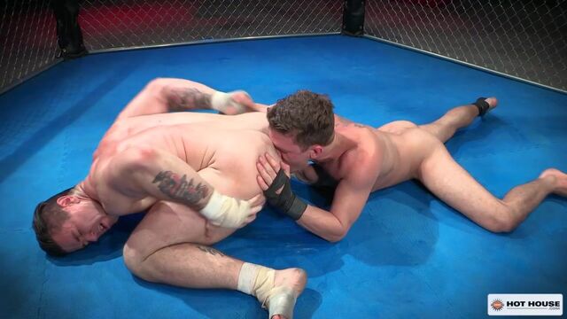 Trenton Ducati and Alexander Gustavo circle the ring, psyching each other out in an ultimate showdown for the fucking title. Trenton wins the first round, pinning Alexander to the ground. They lose their shorts for round 2, wrestling on the ground in their jockstraps. For round three they're fully nude, Trenton takes the win just before both studs fall on each other, sucking each other's cocks and pressing their lips together in passionate kissing. Trenton buries his face in Alexander's ass, and Alexander gulps down Trenton's thick cock, dripping thick spit onto the mat. Stretching Alexander's ass wide, Trenton spits directly into his hole, then shoves his tongue inside. With Alexander's hole fully lubed, Trenton gives it to him doggy style, slamming his cock deep into his firm butt. To gain even deeper penetration, Trenton puts his foot on Alexander's shoulder. Standing up, Alexander grips the chain link cage surrounding the ring as Trenton continues his pounding. Trenton fucks Alexander so hard that he shoots hands-free, dripping his thick, white semen across the ring. Kneeling down, Alexander opens his mouth for Trenton's massive, spurting cum shot. TKO and done.