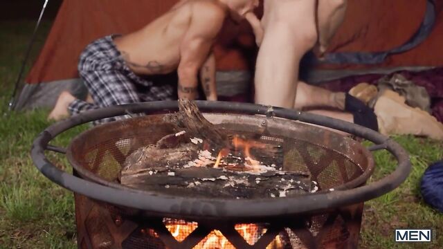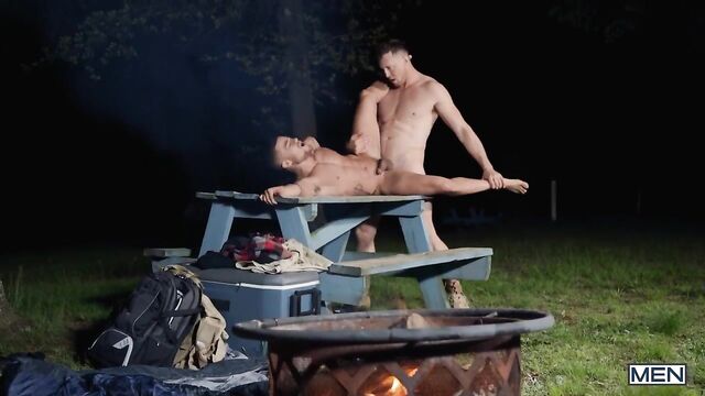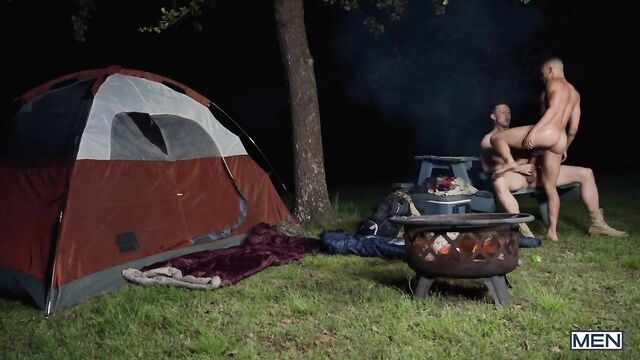 Beaux Banks, Pierce Paris and Oliver Dean went out into the woods to prove once and for all whether or not the legends of Big Cock are real. The three muscular hunks lounge by the fire, watching for signs of the mythical figure, but when Oliver takes off into the night things take a turn. Left alone, Beaux and Pierce can't contain their long-brewing lust, and soon Beaux discovers that whether Big Cock is fact or fiction, the monster in Pierce's pants is the real thing. Pierce shoves his massive cock down Beaux's throat and the sculpted cutie can't get enough, taking every inch of it. Beaux rides Pierce by the campfire, letting the chiseled hunk pound him hard and deep in the open air.