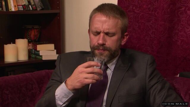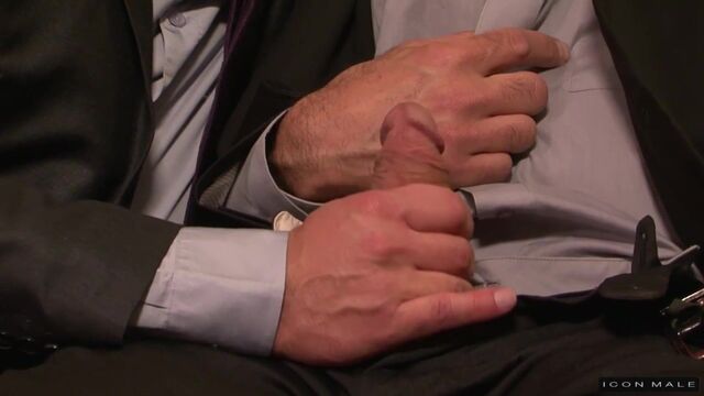 Dirk Caber and Adam Russo indulge in good drinks and cigars in the executive lounge. Talk turns to shopaholic wives and children engrossed in phones and video games. Unlike their families, these gentlemen appreciate good conversation and old fashioned eye contact. Dirk toasts to their success and their experience, and drinks are freely poured. Adam is happy to get together with his friend but warns driving home won't be an option if he keeps drinking, and jokes about having a bad influence. Dirk takes advantage of his friend's naivety. His hand rests on his leg and he compliments the hard strong thighs he's been working out. Adam is visibly uncomfortable, confused by his compliments and innuendo, but Dirk continues to test just how far he can push his old friend. Adam isn't sure whether or not he's misreading his actions but it's plainly laid out on the table; He tells him the only thing missing from their evening of indulgence is sex. An activity for which they don't need their wives!Dirk reaches towards Adam feels his firm chest through the soft wool of his business suit. Staring intently into his eyes, he seductively reaches between Adam's legs and rubs his inner thigh. Pulling on his necktie after unbuttoning his shirt, the silver fox strokes the hair on Adam's bare chest. Although he doesn't look very comfortable, he isn't fighting Dirk's insistence. Bit by bit Adam gives in, and as Dirk moves his hand to the front of his pants, he relents. Adam allows his big cut cock to be pulled from his pants, It's stroked before Dirk leans forward to lick the tip and bring it into his mouth. As he sucks on the stiff cock, he places Adam's hand on his ass, where Adam untucks the shirt from his pants. As Dirk sucks on his straight friend's dick, his inhibitions increasingly dissipate. Adam hesitantly but curiously unbuttons Dirk's shirt and licks his exposed nipples. This makes Dirk moan with pleasure, and Adam reticently lowers his mouth onto Dirk's prick. With a bit of encouragement, he reaches towards his ass hole, fingering it while he sucks it while thumbing his balls. Adam moves Dirk on to his hands and knees and continues to loosen his hole with his wet fingers. Soon he stands up and pulls his dick out of his pants, excitedly ready to ram the other gentleman. Steadily pumping into Dirk's ass, he makes him cum all over himself, and it isn't long before Adam is ready to cum himself, blowing his load on Dirk's engorged cock.