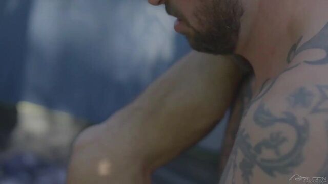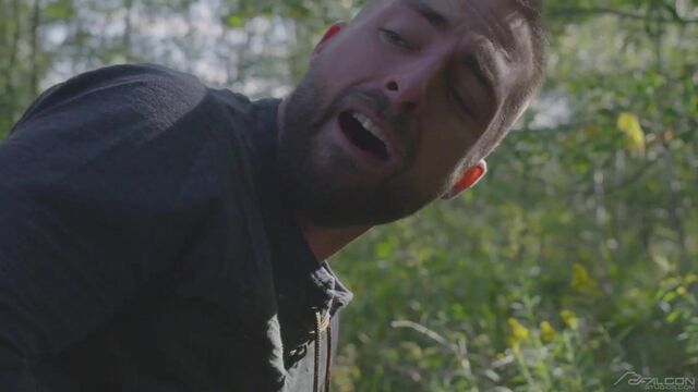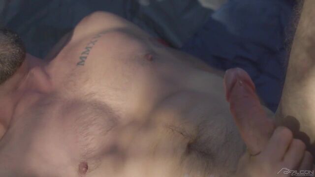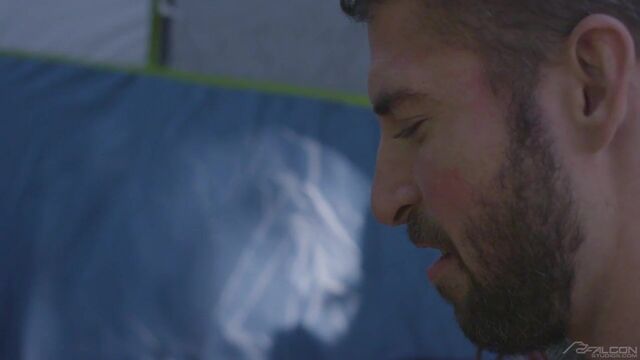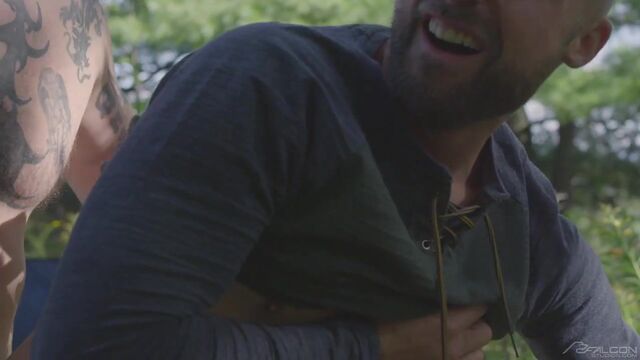 While out hiking alone on the trails, Jeremy London runs into tatted stud Derek Thibeau undressing at his campsite. He decides to sit back in the brush and watch as Derek strips completely naked and takes shower. Jeremy starts stroking his bulge thru his shorts at the site of Derek's soaking wet body, glistening under the water and sun. After Derek towels off, Jeremy accidentally breaks a stick and gets noticed. Since he's already here, Derek invites him into the campsite to give his uncut cock a sopping wet hummer. The thick cock grows rapidly in Jeremy's mouth and he struggles to get his mouth down to the base. Derek wants more and bends Jeremy over a tree to introduce his raw cock into his tight hole. Jeremy reaches back and spreads his ass so Derek can have full bareback access. They move the fucking inside the tent where Jeremy impales his hole on Derek's fuck stick. Switching positions one last time, Jeremy ends up on his back letting Derek have total control of his ass. Derek keeps pumping while Jeremy jerks out a load that hits his abs. Jeremy is still hungry for cum, so Derek takes him out of the tent and covers the bearded studs face in a thick load.