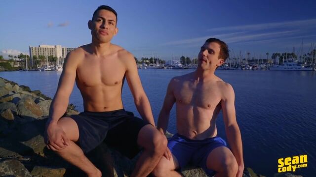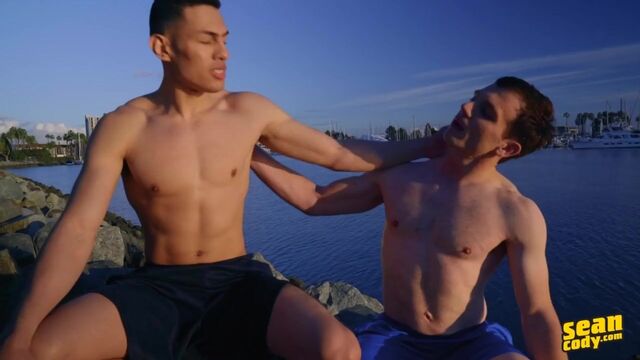 Ernie and Greyson make the perfect match with their fit and toned bodies. They lift some weights by the beach as they prepare to unleash their pent-up energy on each other in the bedroom. “I’m a little nervous,” says Greyson, because “I don’t know how big