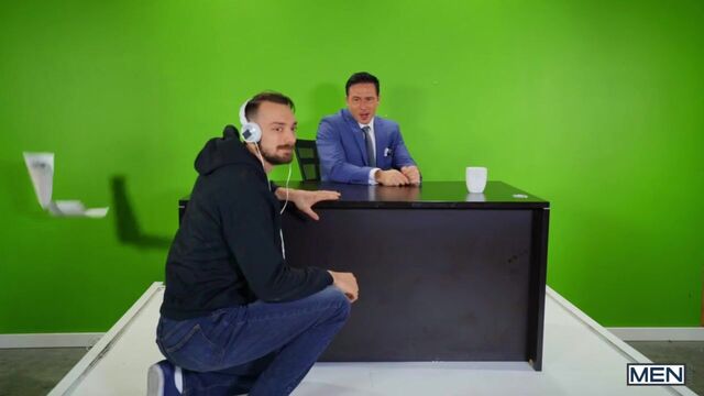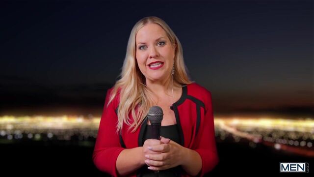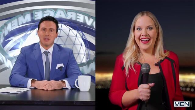 It's been a hell of a year, and on New Year's Eve, news anchor Reese Rideout just can't hold it together anymore, erupting in a rant live on camera. His cohost asks him to at least wait until the ball drop, so Reese calls handsome camera operator Johnny B onto the set and drops his balls into Johnny's mouth! As their signal is cut, Johnny sucks Reese's cock, then rides the anchor's dick, and Reese bends the bottom over the news desk to pound him doggystyle. Reese fingers Johnny's hole and licks it, then fucks him spoon, and Johnny cums as Reese penetrates him nice and deep in missionary, then takes the newsman's hot facial.
